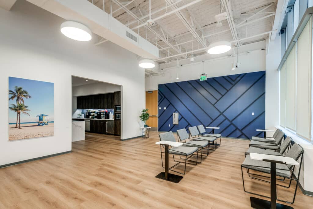 The employee break area was designed as a warm, inviting space for gathering and recharging. A custom millwork accent wall adds texture and architectural depth, while PVC art prints bring in vibrant imagery that reinforces brand identity and enhances the overall atmosphere.