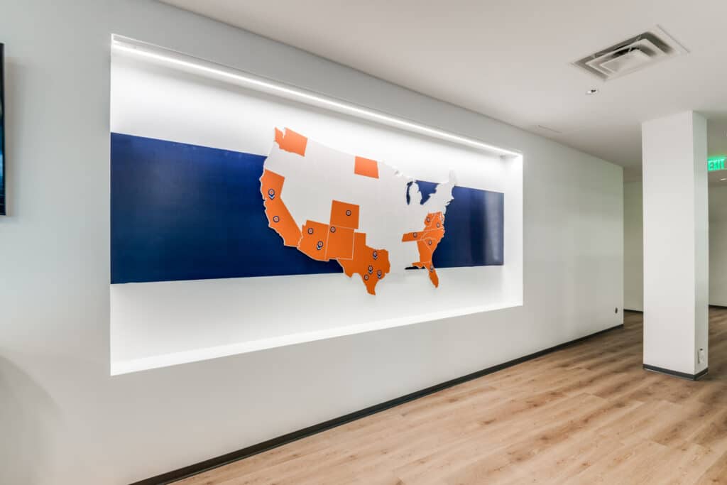 A dimensional location map highlights RealManage’s national footprint, providing both a functional and visual focal point within the space. Custom glass film balances privacy with transparency in offices and conference rooms, and wayfinding signage and room identifiers were designed to be clear, consistent, and easy to navigate.