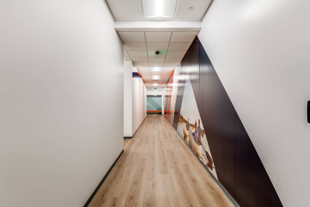 In the lobby, a custom acrylic logo makes a strong first impression, setting the tone as visitors enter. Throughout the office, full-height wall wraps introduce brand color, movement, and storytelling—energizing corridors and creating visual continuity across the workplace.
